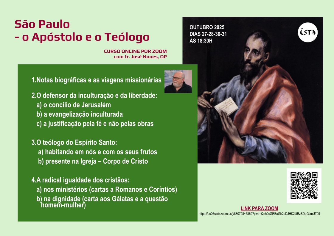 Em outubro de 2025 o Instituto São Tomás de Aquino (ISTA) realizou um curso online sobre "São Paulo - O Apóstolo e o Teólogo". Orientado pelo Fr. José Nunes, OP, o curso decorreu nos dias 27, 28, 30 e 31. Foi uma oportunidade valiosa para aprofundar o conhecimento sobre uma das figuras mais influentes do cristianismo. Disponibilizamos aqui os links para os vídeos das sessões permitindo a todos rever ou assistir pela primeira vez ao conteúdo deste importante curso teológico.